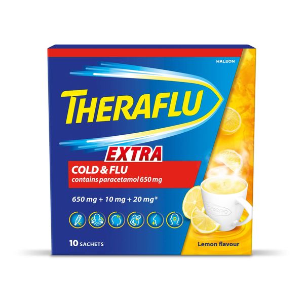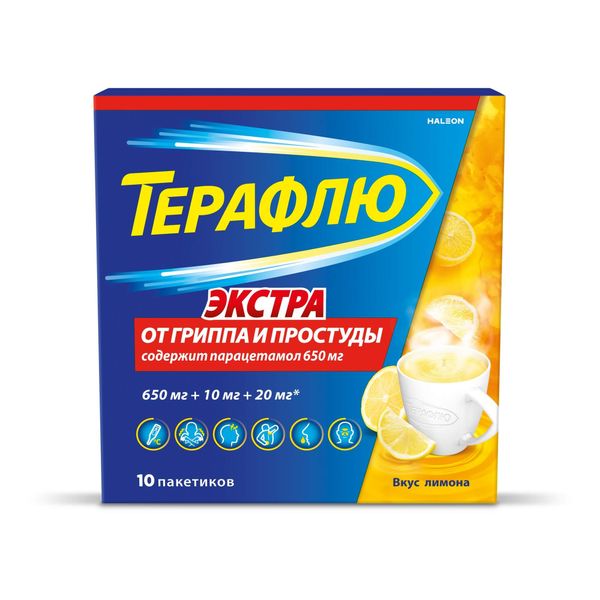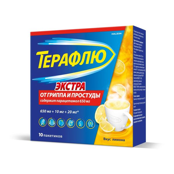 ТераФлю Экстра порошок для приготовления раствора для приема внутрь лимонный 650мг+10мг+20мг пакетики №10