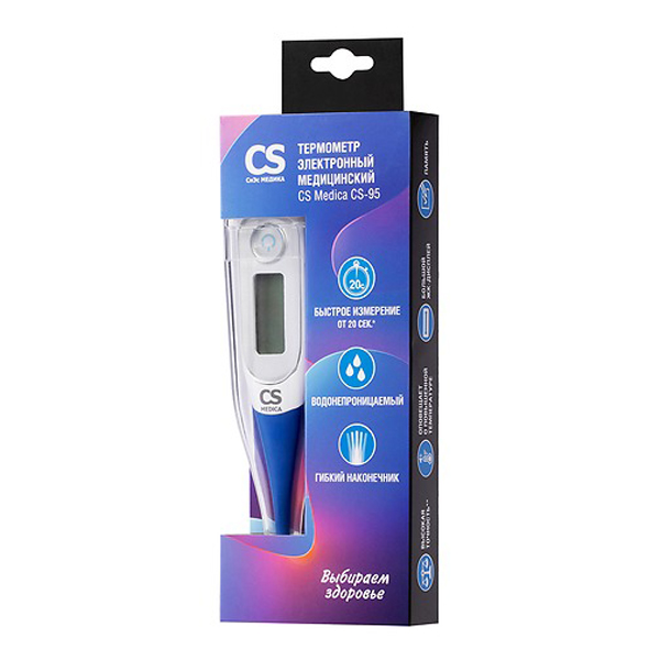 Электронный термометр CS Medica CS-95 - высокоточный прибор с большим дисплеем и мягким наконечником для измерения тела ректальным, аксиллярным и оральным способами взрослым и детям. Термометр относится к категории оборудования домашнего назначения.