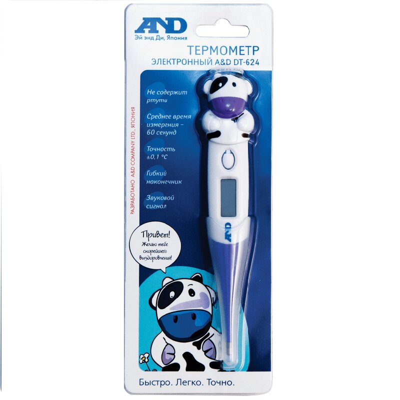 Электронный термометр (или градусник) AND DT-624, Коровка, предназначен для измерения температуры тела человека тремя способами: орально, в подмышечной впадине (аксиллярно) или ректально. Время измерения около 60 сек. Прибор отличает яркий и необычный дизайн, который выполнен в виде забавной коровки, наверняка, понравится детям.