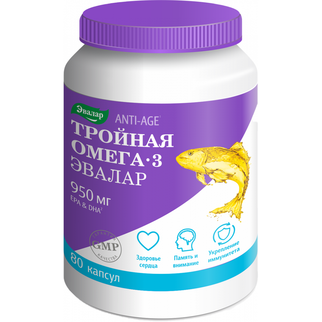 - Самая высокая1 дозировка омега-3 в 1 капсуле. Тройная Омега-3 Эвалар содержит 950 мг незаменимых ПНЖК омега-3 (ЭПК + ДГК), вместо 300 мг, как в обычных.