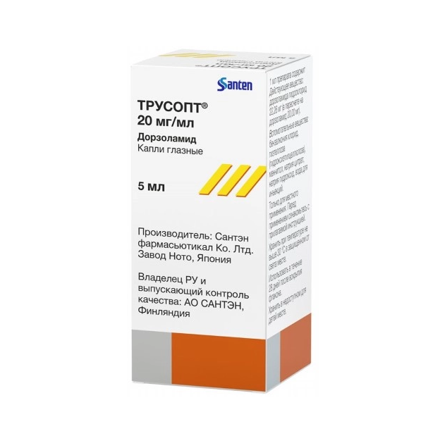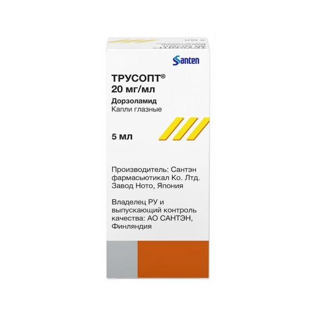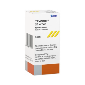 Препарат Трусопт® содержит дорзоламида гидрохлорид, который является сильным селективным ингибитором карбоангидразы II человека. После местного офтальмологического применения дорзоламида повышенное ВГД снижается независимо от того, связано оно с глаукомой или нет. Повышенное ВГД является основным фактором риска в патогенезе повреждения зрительного нерва и сужения полей зрения. Дорзоламид снижает ВГД без общих для миотических препаратов побочных действий, таких как никталопия, спазм аккомодации и сужение зрачков. Дорзоламид оказывает минимальное или практически не оказывает влияния на частоту пульса или артериальное давление.