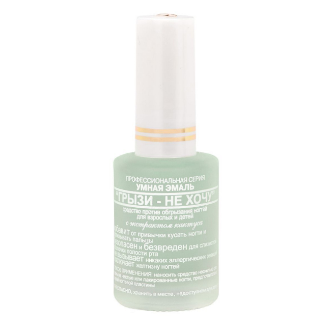 Высокоэффективная, водостойкая формула препарата поможет легко, безболезненно и навсегда избавиться от вредной привычки обкусывать ногти и облизывать пальцы. Уникальная гипоаллергенная формула и абсолютно безвредный для человеческого организма горький вкусовой компонент – экстракт кактуса – позволяют рекомендовать препарат как взрослым, так и детям. Горький привкус препарата настолько отвратителен, что не каждый взрослый или ребёнок захочет повторить это ещё раз. Препарат незаметен при нанесении на ноготь и кутикулу, полностью исключает пожелтение ногтей. Препарат устойчив к воде и моющим средствам, эффективно действует в течение всего дня. Курс рассчитан на несколько недель, до появления устойчивого рефлекса к этой дурной привычке. Вредная привычка обкусывать ногти встречается у многих людей. В препарат включен безвредный, но неприятный на вкус экстракт кактуса."Грызи - не хочу" обладает повышенной стойкостью к воде и моющим средствам, и сохраняет свои свойства в течение суток. На вкус препарат настолько неприятен, что дурная привычка исчезает сама по себе.