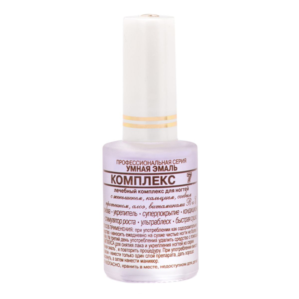 Комплекс №7 укрепляет и значительно оздоравливает ногтевое полотно. После высыхания на поверхности ногтя образуется тонкое защитное покрытие. Витамины групп B и A ощутимо стимулируют рост и регенерационные способности ногтя. Экстракты женьшеня, алоэ и соевого протеина отлично питают ногтевое ложе. Средство быстро высыхает и оставляет вместе с защитным покрытием потрясающий ультра блеск.