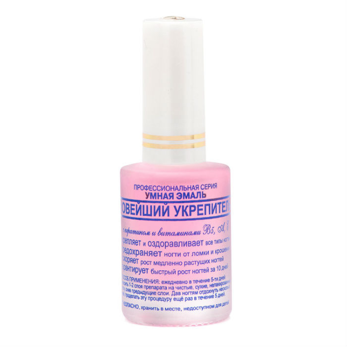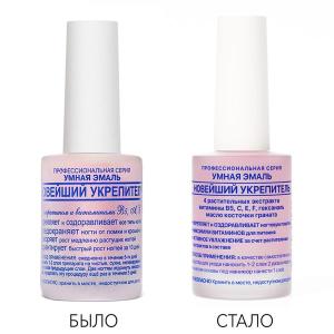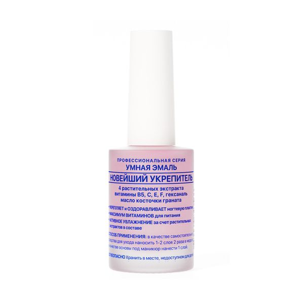 Препарат «НОВЕЙШИЙ УКРЕПИТЕЛЬ» является разработкой следующего поколения средств по уходу за ногтями коллекции «Умная эмаль» с использованием инженерных технологий. Новое средство сохранило все лучшие свойства и качество «укрепителя ногтей», при этом уникальная формула препарата позволяет быстрее и точнее проникать в роговую ткань ногтевого полотна, особым образом создавая жесткую, очень прочную полимерную структуру молекул.