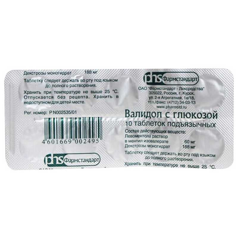 действующие вещества: левоментола раствор в ментил изовалерате (валидол) - 60 мг, декстрозы моногидрат (глюкозы моногидрат) -188 мг