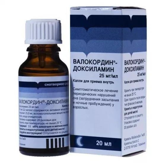 Валокордин® — Доксиламин содержит 55 об. % этанола (до 900 мг на дозу (22 капли), что соответствует 21,87 мл пива или 9,11 мл вина), что может