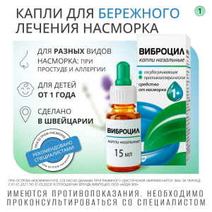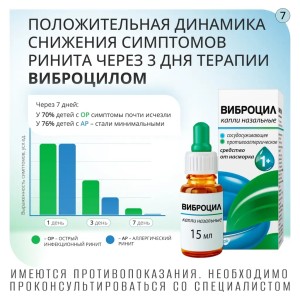 Виброцил® не следует применять непрерывно на протяжении более 7 дней без консультации с врачом. Длительное или чрезмерное применение препарата может вызвать тахифилаксию и эффект «рикошета», связанный с повторным развитием заложенности носа (медикаментозный ринит), привести к развитию системного сосудосуживающего действия.
