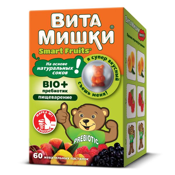 ВитаМишки® Bio+ пребиотик – сбалансированный витаминно-растительный комплекс с пребиотиками в виде вкусных мармеладных пастилок-мишек с натуральными фруктовыми и овощными экстрактами для детей с 3-х лет.