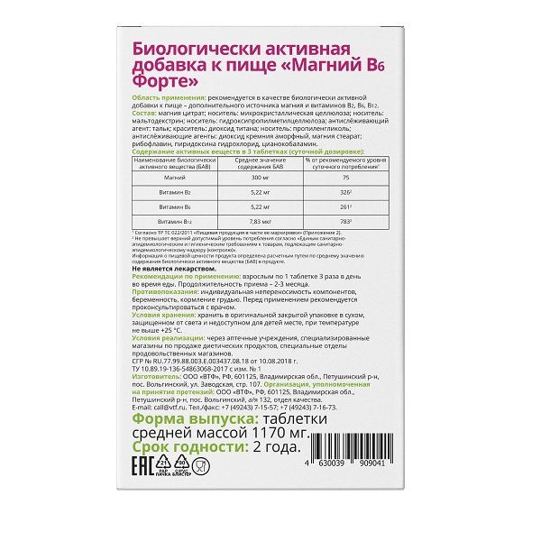 Магния цитрат носитель: микрокристаллическая целлюлоза носитель: мальтодекстрин носитель: гидроксипропилметилцеллюлоза антислёживающий агент: тальк краситель: диоксид титана носитель: пропиленгликоль антислёживающие агенты: диоксид кремния аморфный, магния стеарат рибофлавин, пиридоксина гидрохлорид, цианокобаламин.