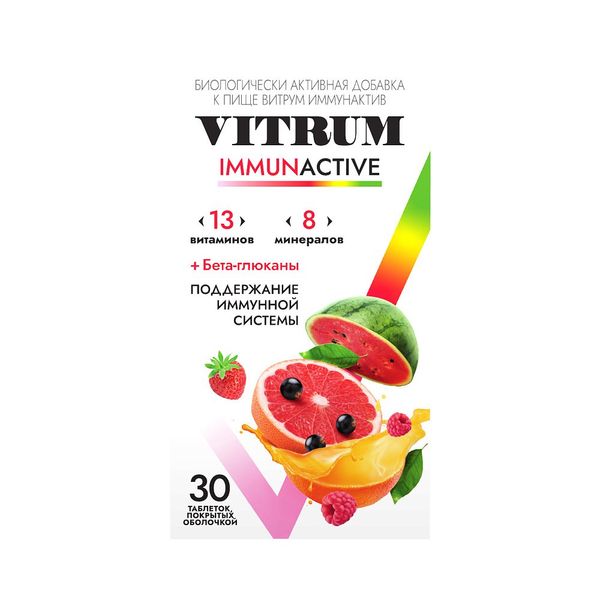 Витаминно-минеральный комплекс ВИТРУМ ИММУНАКТИВ VITRUM IMMUNACTIVE содержит 13 витаминов и 8 минералов, а также бета-глюканы и биофлаваноидный комплекс — необходимые компоненты, которые синергично работают для поддержки иммунитета: