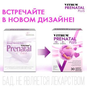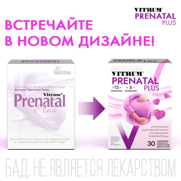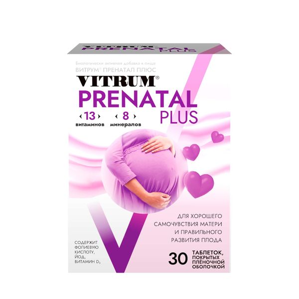 Витрум® Пренатал Плюс (Vitrum® Prenatal Plus) - Биологически активная добавка (БАД) к пище - для хорошего самочувствия матери и правильного развития плода. Восполнение недостатка витаминов и минералов во время беременности, а также снижение риска развития гиповитаминозов и недостатка минеральных веществ в послеродовой период и в период кормления Снижение риска развития железодефицитной анемии у беременных и дефицита йода в организме матери и плода.
