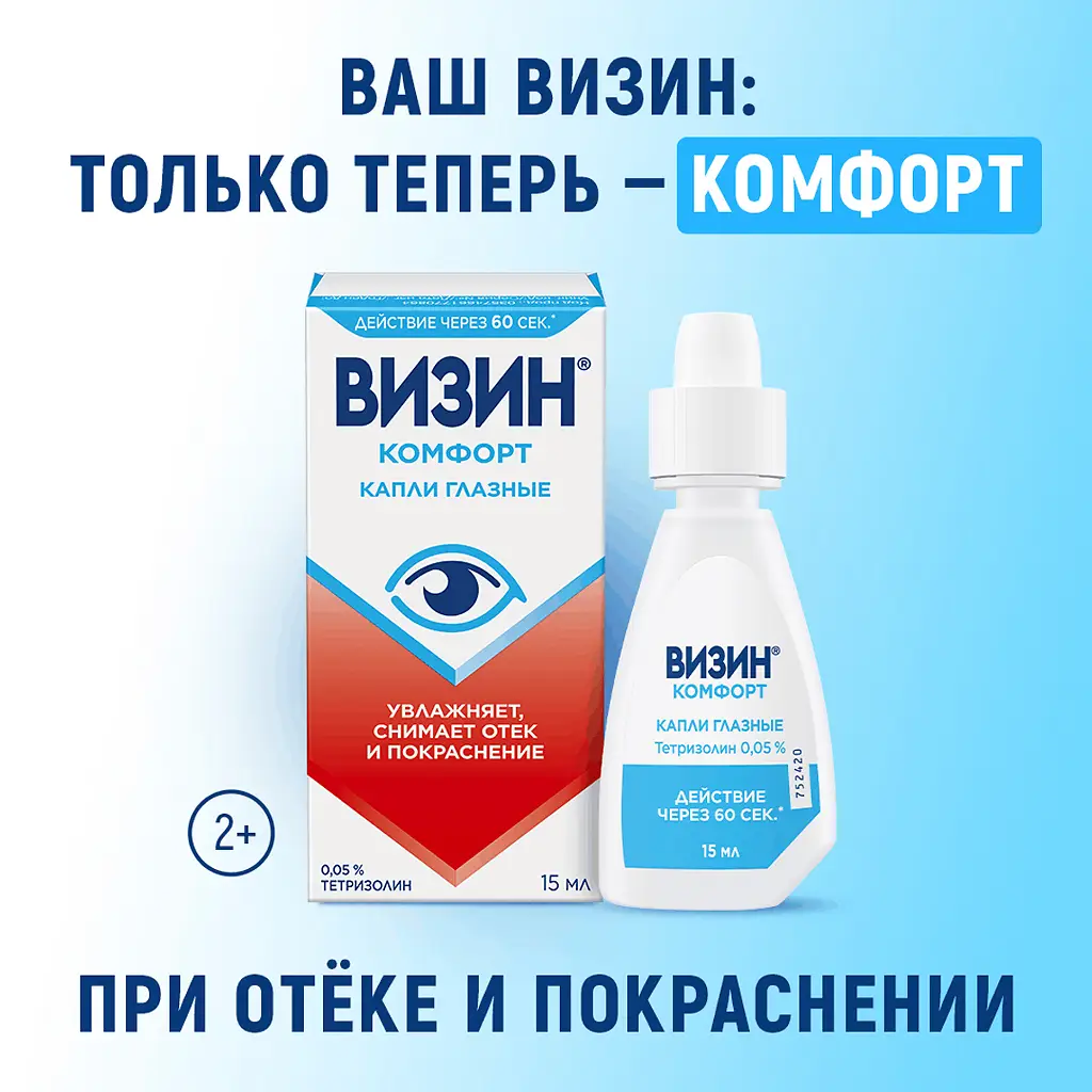Тетризолин, содержащийся в препарате Визин® ;Комфорт, обладает сосудосуживающим действием и уменьшает отёк тканей. Эффект начинается через 60 секунд после закапывания и продолжается 4–8 часов.
