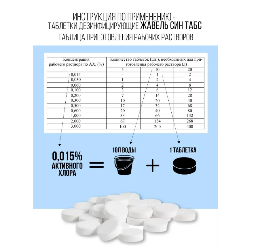 Дезинфицирующее средство Жавель Син Табс таблетки 300 штук. Средство «Жавель Син Табс» представляет собой таблетки цилиндрической формы с одной фаской белого цвета с характерным запахом хлора, массой 3,6±0,3 г. В качестве действующего вещества в состав средства входит натриевая соль дихлоризоциануровой кислоты–80,5%, а также вспомогательные вещества (адипиновая кислота, натрий карбонат и натрий бикарбонат). Массовая доля активного хлора г, таблетки 1,70±0,17. Время растворения таблетки не более 15 минут.