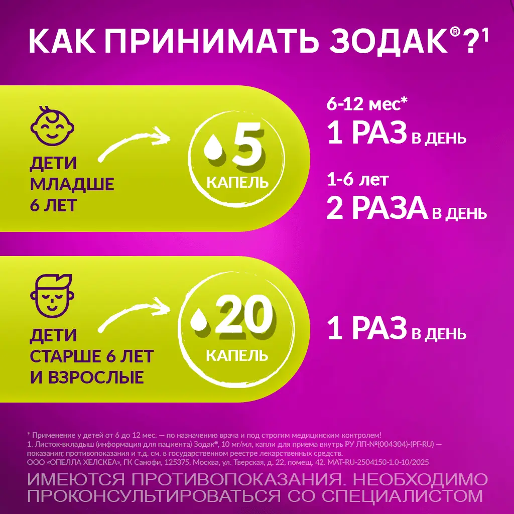 Детям от 6 до 12 лет: по 10 мг цетиризина (20 капель) Г раз в сутки или по 5 мг цетиризина (10 капель) 2 раза в сутки (утром и вечером).